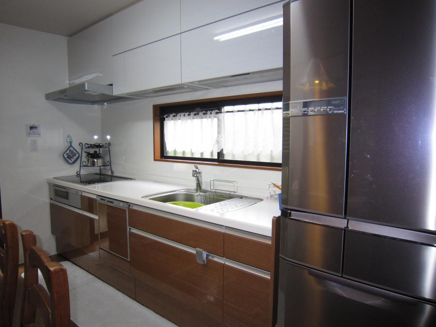 リビングから見たときに、スッキリ片づいてみえるように、キッチンカウンターのの上にでている◎ふきん、◎まな板などの小物類を、吊戸棚(オートダウン収納)をつかって、使わないときにはしっかり収納。