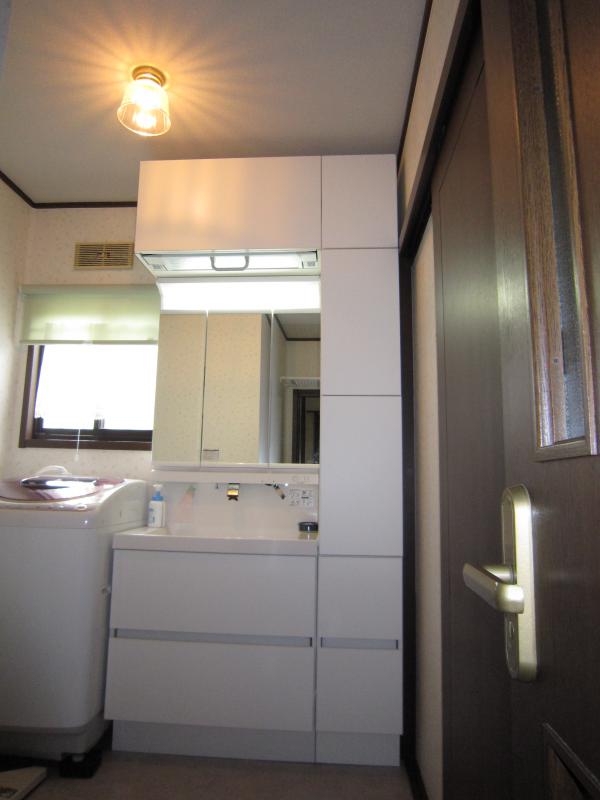 洗面化粧台は、ダウン機構付の吊戸棚や、フルスライドキャビネット、三面鏡で取り出しやすく、しっかり収納。