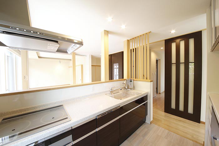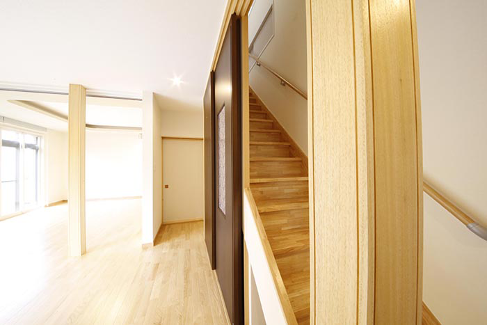 そこで、キッチン、ダイニング、リビングを一つにして開放感のある空間を創るために玄関の位置を変えてスペースを確保。部屋を分けるための引き戸を効果的に使う事で一つの空間が様々な形に変化するようにいたしました。