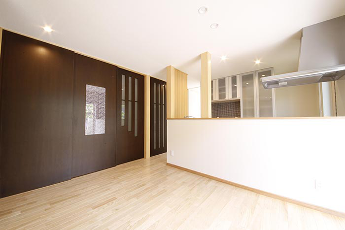 そこで、キッチン、ダイニング、リビングを一つにして開放感のある空間を創るために玄関の位置を変えてスペースを確保。部屋を分けるための引き戸を効果的に使う事で一つの空間が様々な形に変化するようにいたしました。