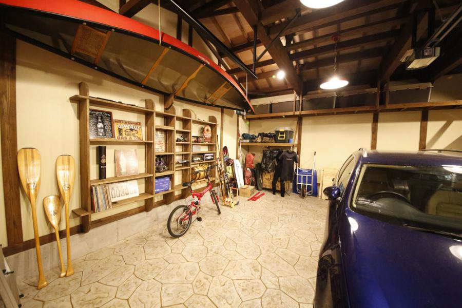・お客様が集めたアンティーク家具の雰囲気に合わせて、ラウンジ内部は色、材木の樹種、カットの仕方等を吟味。 ・ライティング計画にも数度の打合せを重ね、影の部分をどう作るかがポイントでした。 ・ガレージ部分には趣味が多彩なお客様の「ギア(gear)」を視覚的に楽しめる収納方法をお客様と造り上げました。 ・万が一の災害にも耐えれるよう、今までの倉庫より一段と強度も高めました。